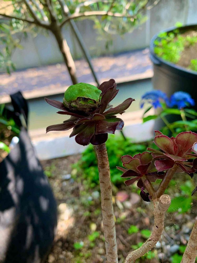 なかなか休憩場所を選択するセンスがあるアマガエル君ですわ😄