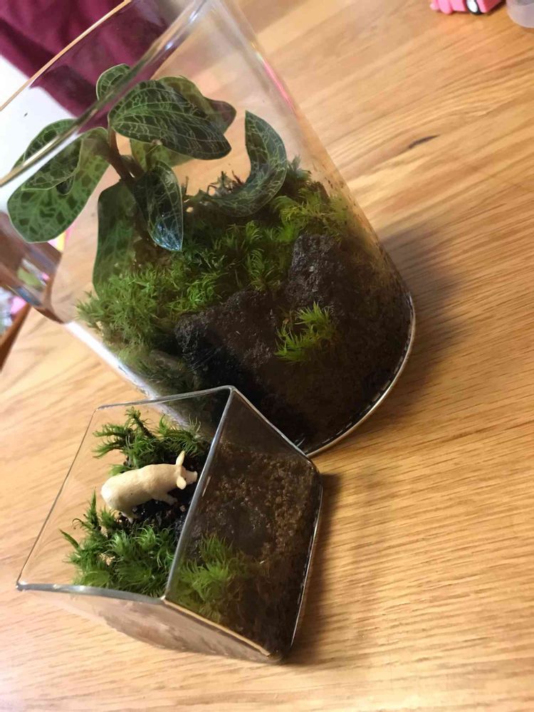 苔テラリウムデビュー。ジュエルオーキッドを植えたくてやったのですが、容器が小さかった😅ジュエルオーキッドは植え替えに弱いとどこかで見たので、水苔はそのままで周りにソイルを。