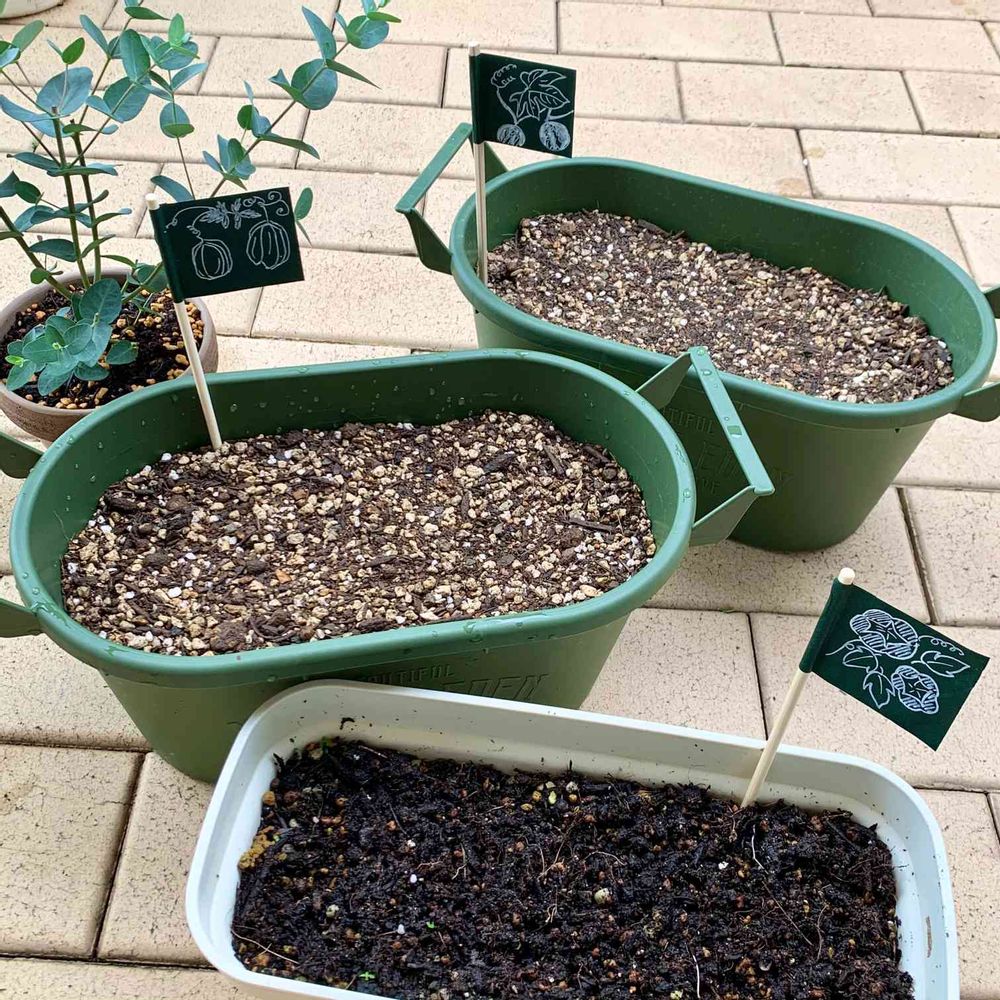 色々と植えたのがわかるように、割り箸とマスキングテープで黒板風ピック🚩をつけてみました😆特にスズメウリは初めて育てるのでワクワクします🎶