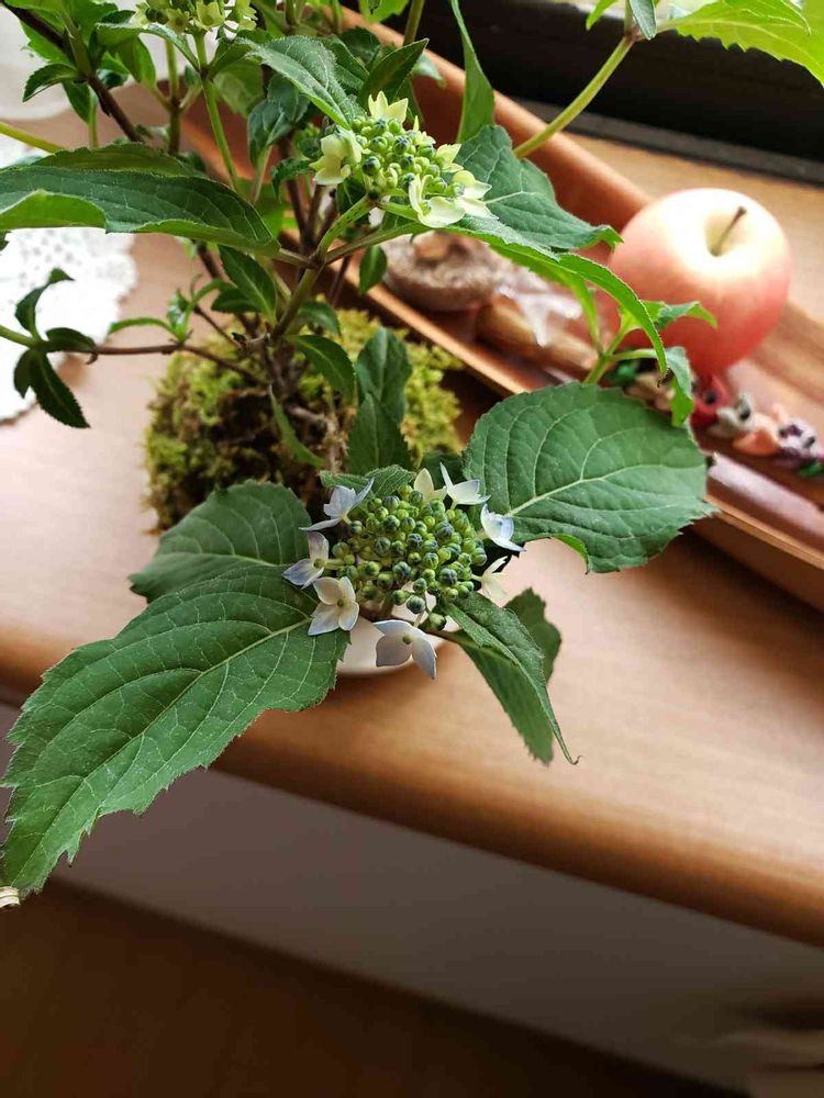 苔玉のヤマアジサイが少しずつ咲いてきました😃
