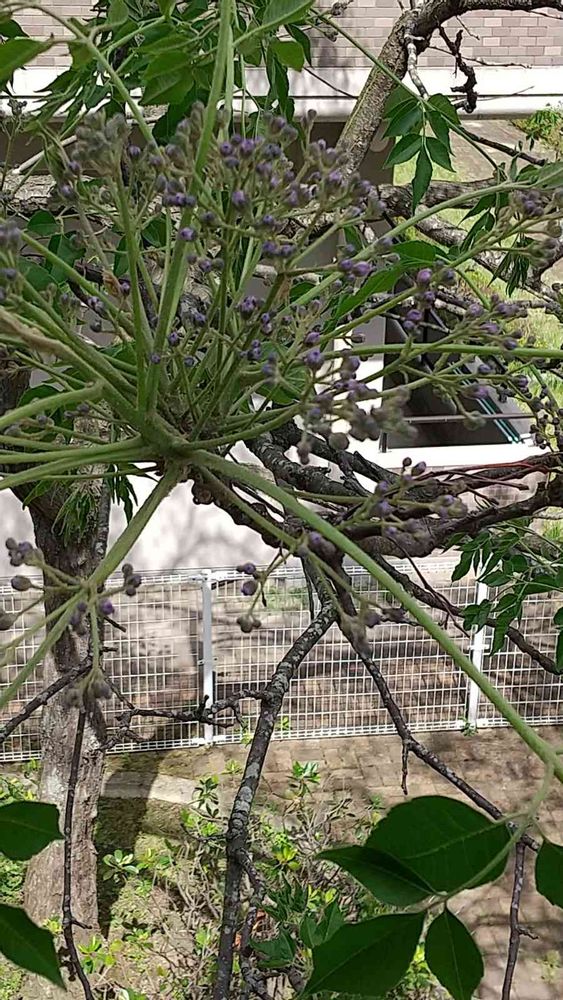 あっという間に栴檀の木に蕾😀✨お花は赤紫っぽいのに、蕾は紫です😆