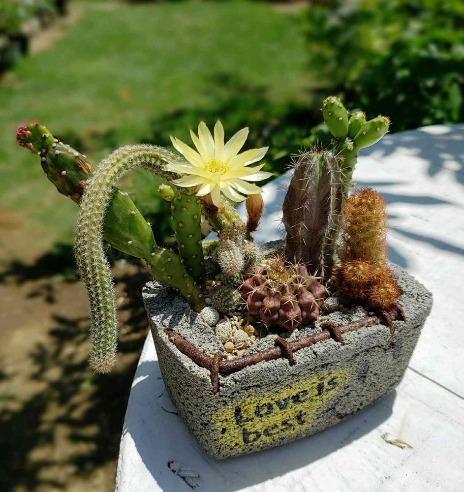サボテン寄せ植えの白檀に蕾がついているのは知っていたけど、黄色いお花が咲くとは思いませんでした❗😃✨