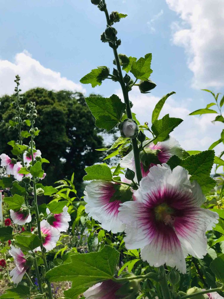 気持ちの良い青空と綺麗に咲いたタチアオイと、シンボルツリー🌳💫💫💫