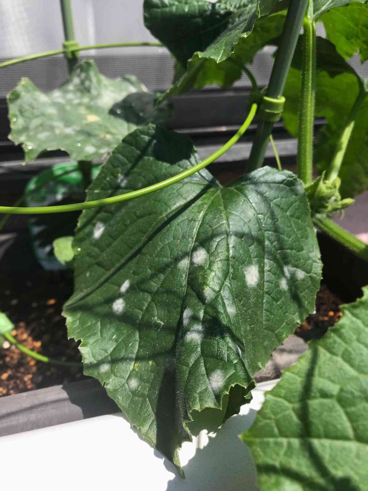 きゅうり ですか? 野菜なら 薬の消毒は 関心しませんが 病気ですから 切りてり 風とおし よくして 木酢液をうすめて 散布 するのも 良いのでは?