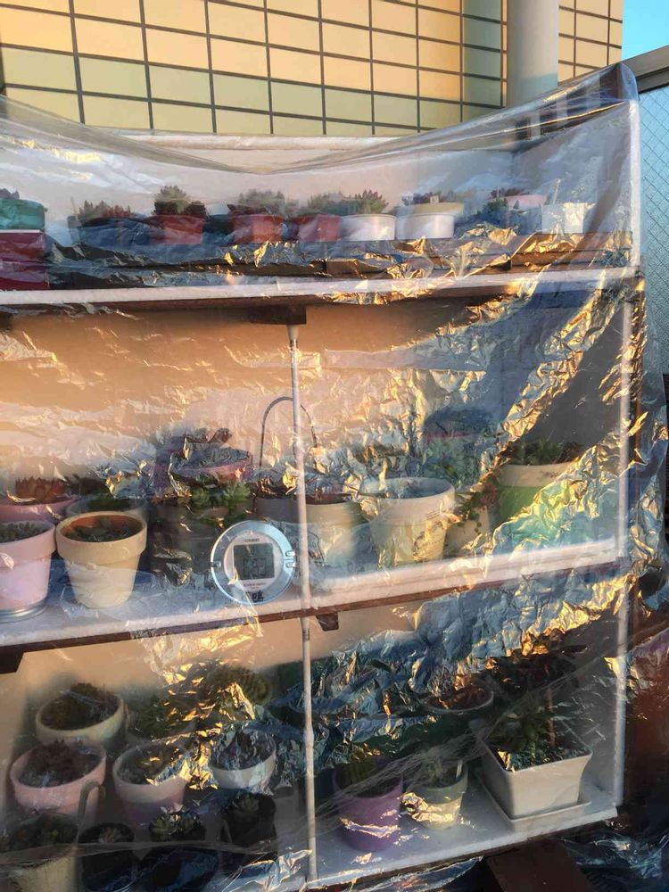 多肉棚の横面、背面にダイソーで売っている白いプチプチを洗濯用ピンチでとめる+寒冷紗で全体をカバー、夜中だけ前面にブランケットをかけたところ、