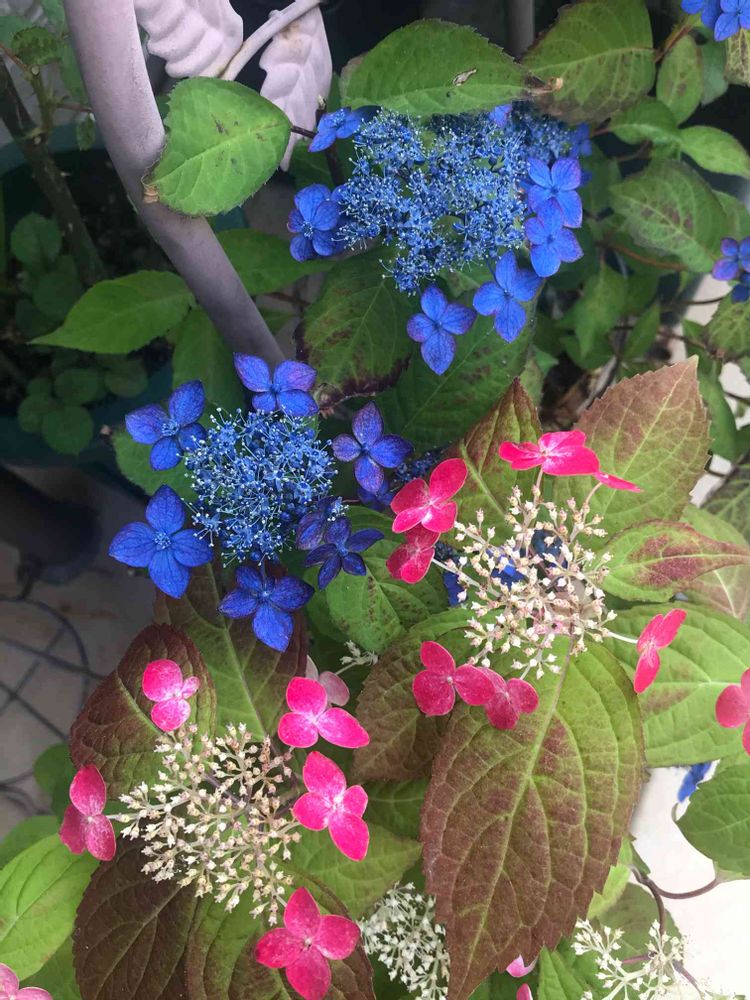 ヤマアジサイ 鉢の並び替え、楽しんでます💠