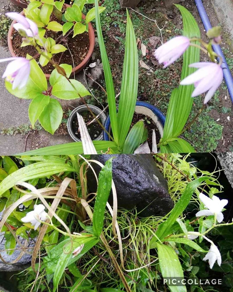 シランが 観音竹の鉢から石付けの鉢から 地面から生えて欲しいよ💦