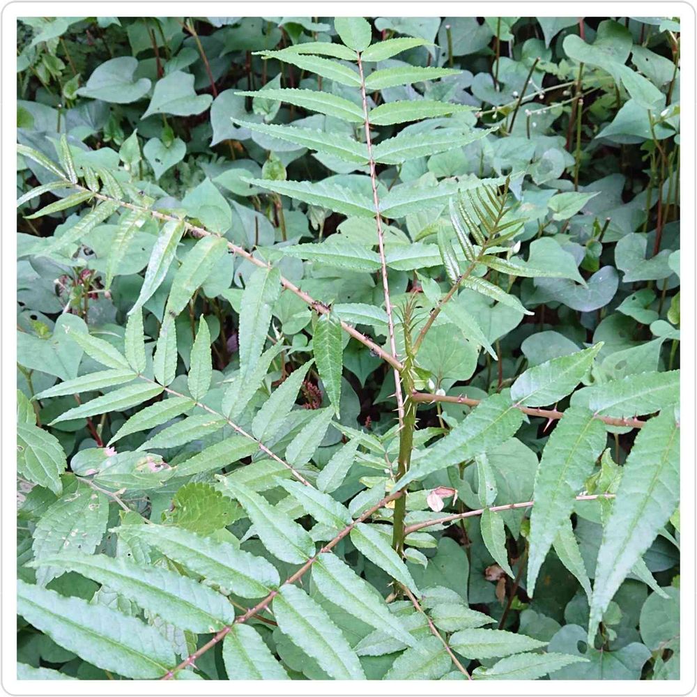 🌿は1回奇数羽状複葉で、トゲが幹やえだにあり、新芽が出てる様子は、タラノキに似ています。