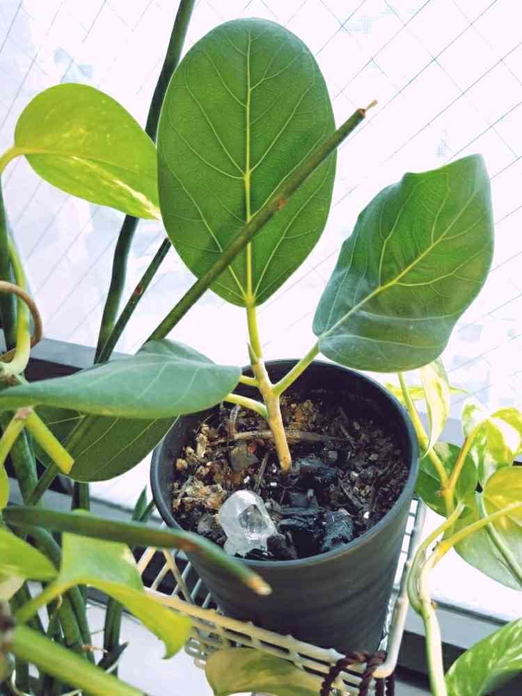 最初はコップに入れて、水から始めて、根っこが出てから土に植え替えしました。土の中には小さなクリスタルと、雷に撃たれて炭化した木のちいさなかけら。