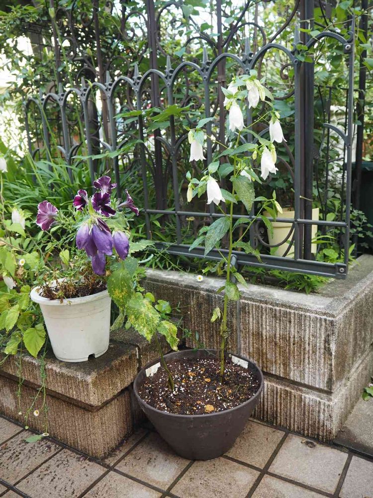昨日師匠a.k.a隣のみよちゃんから白花と青花のホタルブクロをもらう