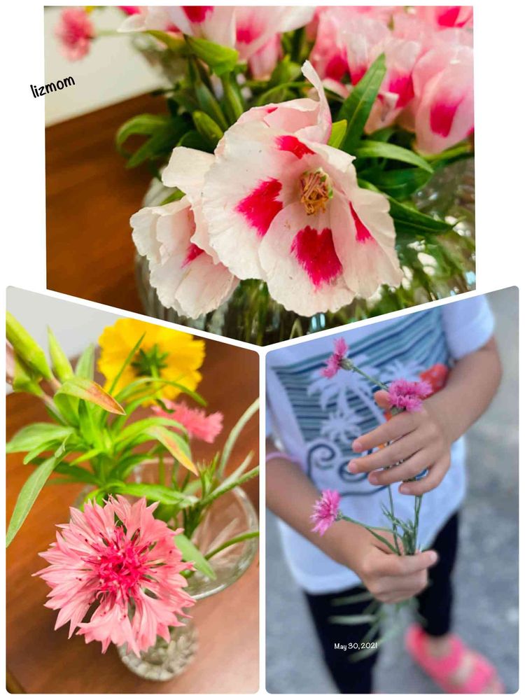 河川敷を歩いていたら、自治体の貸し花畑の一角でお花のお手入れをされていた老夫婦が「お姉ちゃん^^💐」と、娘にゴデチアと矢車草、菊(名前忘れました)をその場で切って渡してくれました💐