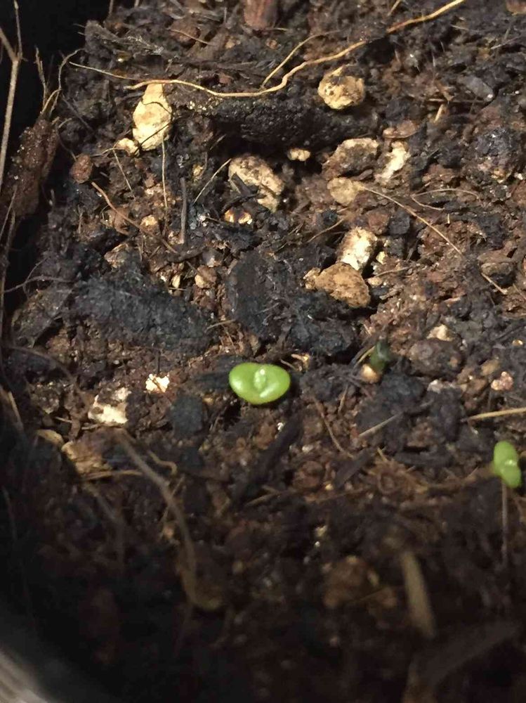 さっきふと見たら、10月9日にタネを蒔いたモニラリアの芽の真ん中にちっちゃいツノが!!!