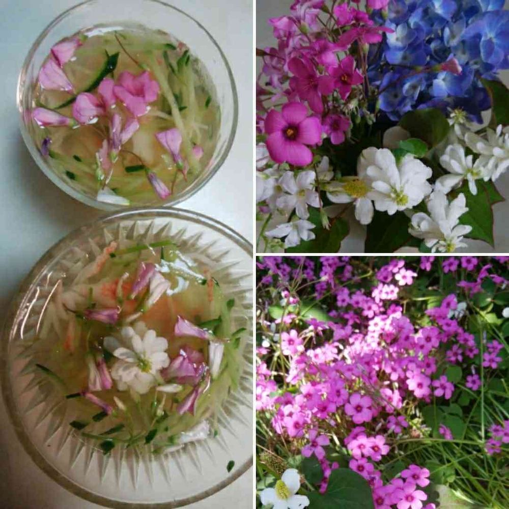 ムラサキカタバミが食べられる事を、すえすえさんに教えて戴いて、私も楽しんでみました。upしてと言って戴きましたので🙇 カニカマとキュウリ薄切りで、ダシ味でゼリー固めにしました。暑いときにいかがですか☺