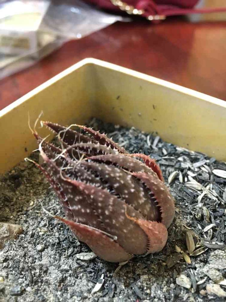 前回名前教えてくださいで初投稿したのですが、写真の貼り付けがよく分からなくて拡大できない写真になってしまったので再投稿しました。あれからくださった方にも聞いたのですが多肉植物なんだけど名前は分からないそう。今にもグワッて口を開けそうでちょっと怖い💦先っちょモケモケ毛が生えてます。