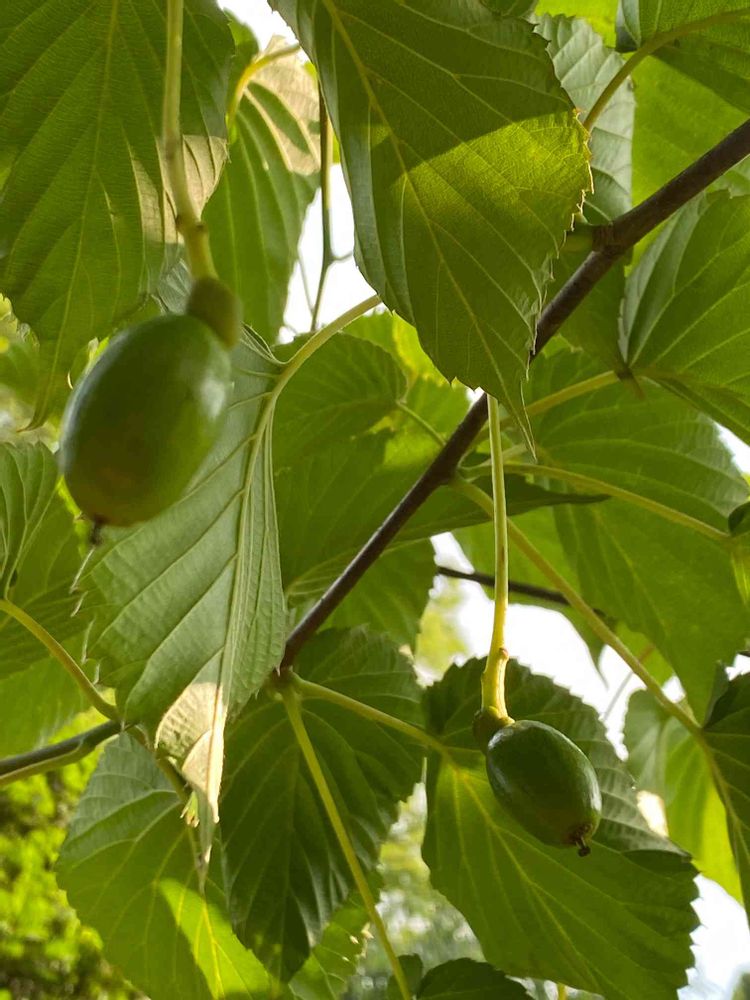 この間は、白いハンカチがヒラヒラと揺れていましたが、今は、まだ青い実が、ぶら下がっていました!