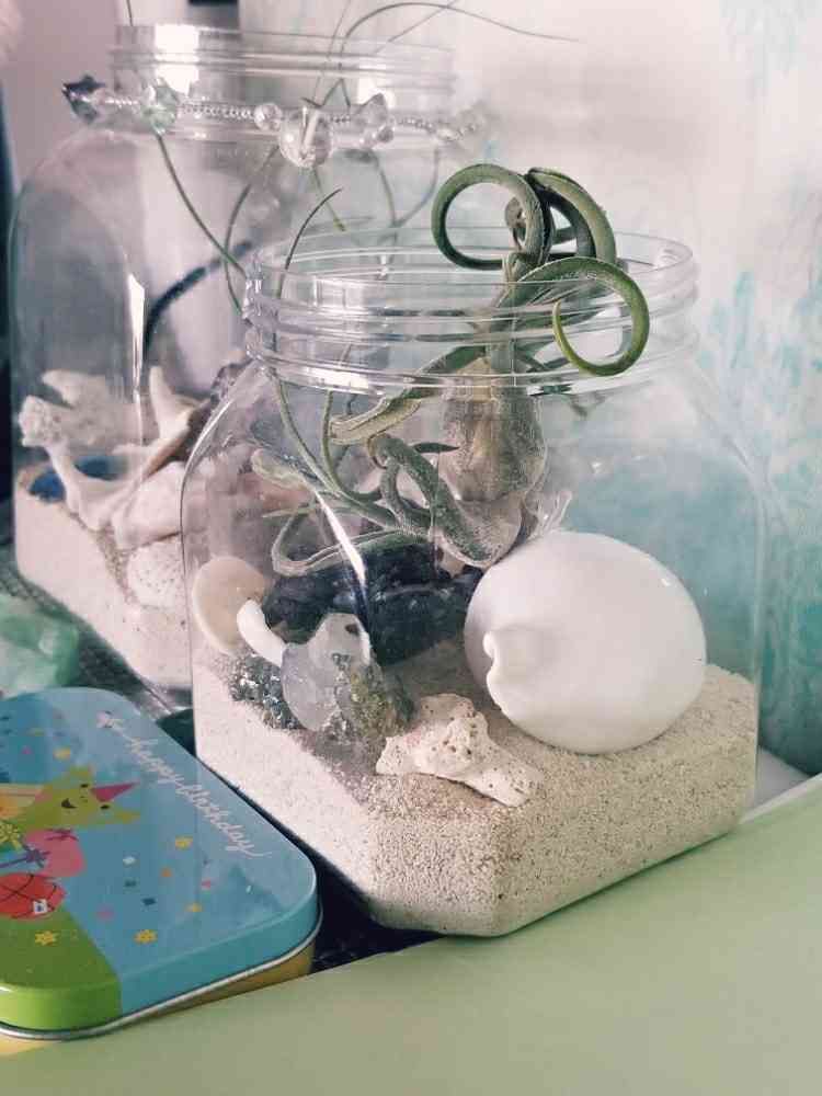 プラスチック容器に、砂と貝殻🐚クリスタルを入れて高さを出してエアープランツ。