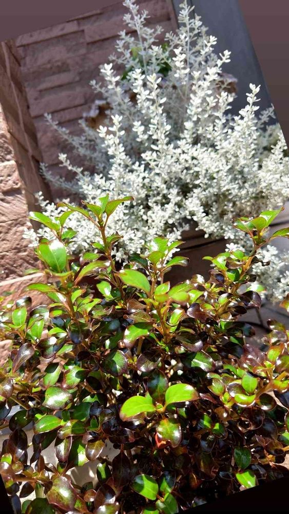 このコプロスマの魅力は一年中ピカピカちゅるちゅるの葉っぱだけですがうしろのオレアリアのスモーキーなシルバーリーフとの対比が美しいの✨✨