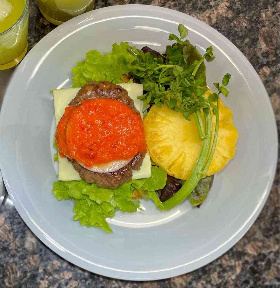 レッドロメインレタス、グリーンオークレタス、クレソン、パイナップルと、モツァレラチーズ、ハンバーグ、玉葱、パプリカソースのサンドイッチ。鶴首南瓜練り込みパン使用。