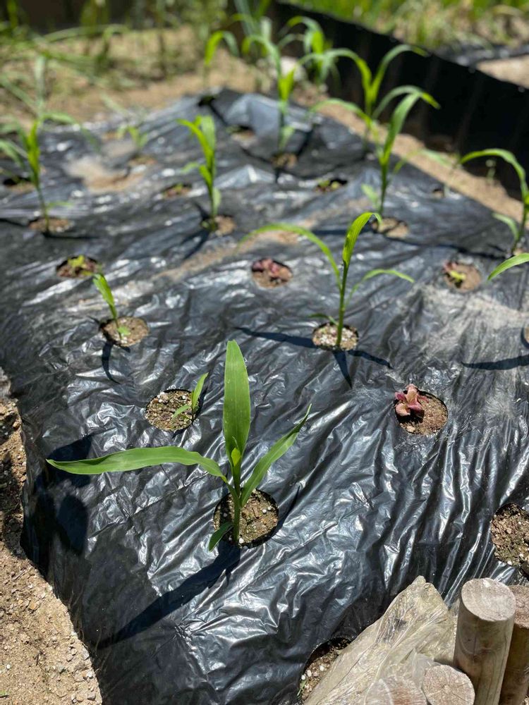 ダイソーで買ったとうもろこしの種が100パー発芽してる❣️大きく育って欲しいなぁ🌽最初から穴あきマルチを敷いたので、空いてるところにレタスミックスの小さい苗を植えました🥬