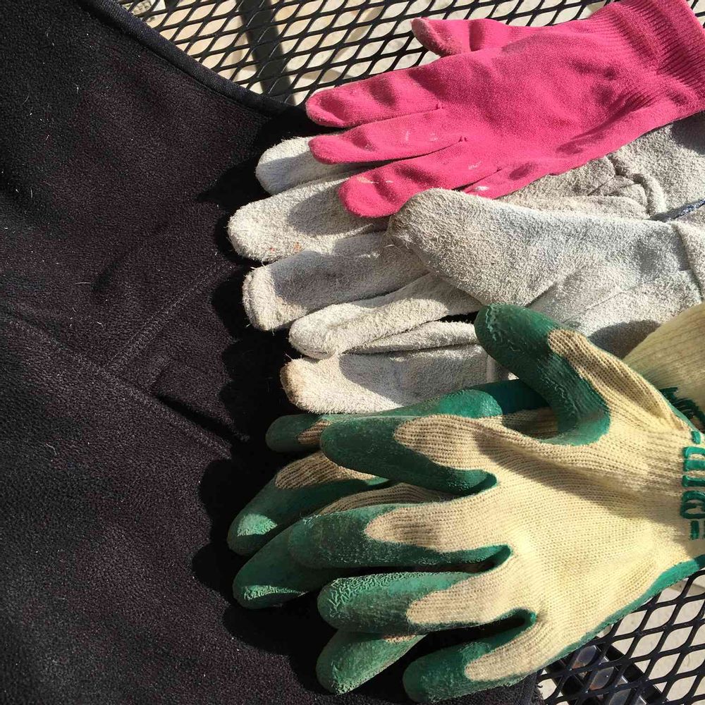 剪定はピンクのぴったりした手袋に革手袋を二重で…革手袋がゆるくて作業しにくいし微妙に痛かったけど二重はだいぶ違う!