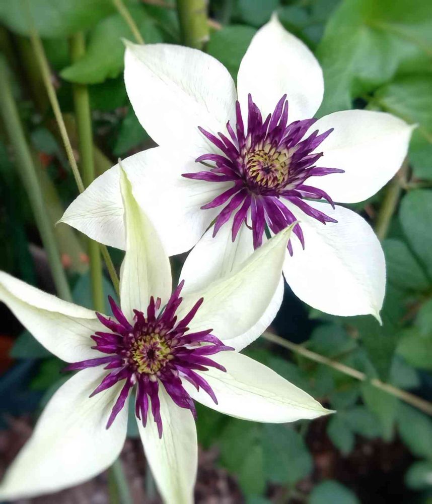 開花時期は初夏から秋(夏を除く)、花色は白色もしくは紫色か緑色、6個の萼片と花弁化した雄蕊からなる八重咲きの花を咲かせます。草姿はツル性で高さは約240cmまで成長して、葉色は緑色、葉身は卵形で単葉もしくは複葉して対生葉序につきます。