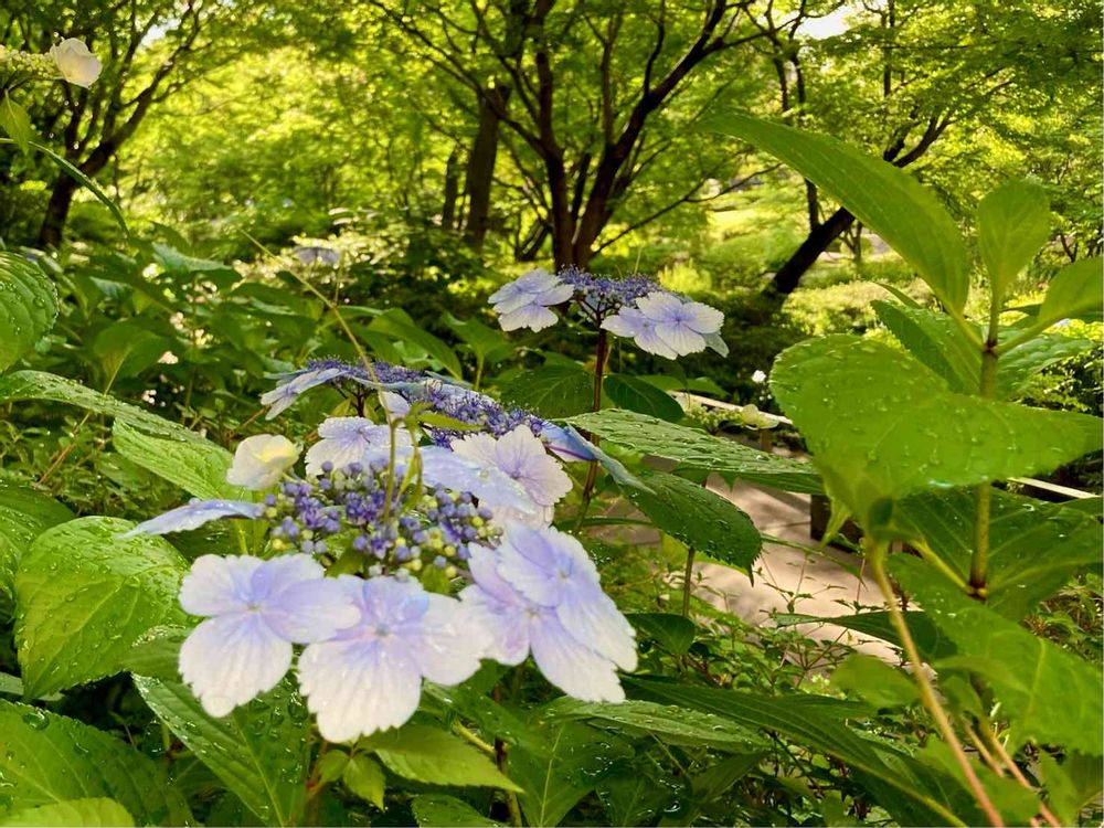 夜雨に濡れたガクアジサイが朝陽を浴びて綺麗でした。