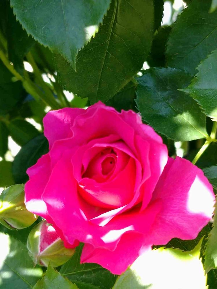 朝日を浴びて眩しそうにしているつるバラてす。