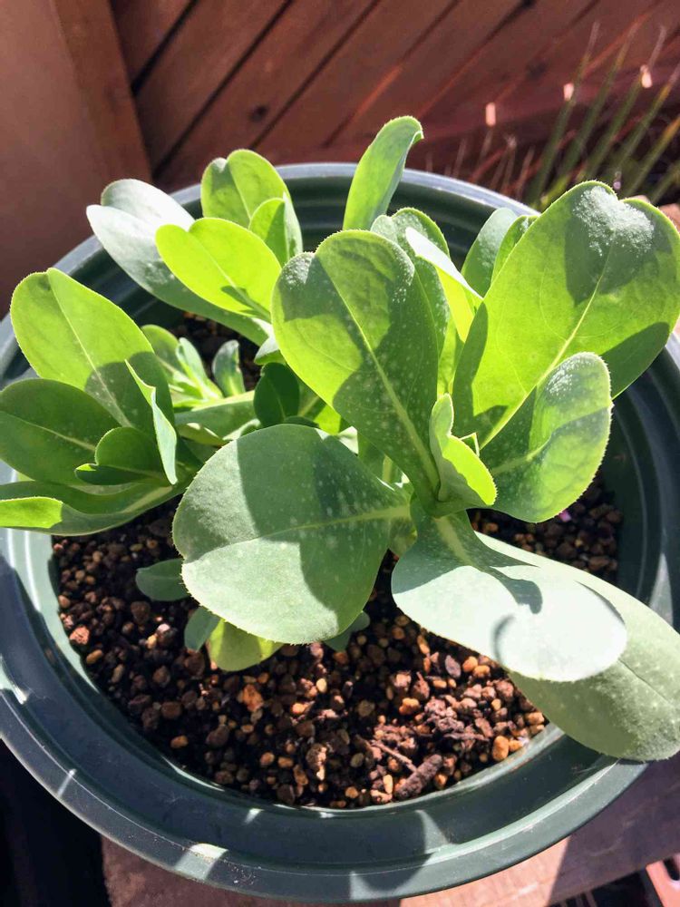 セリンセマヨールの苗発見したので初育てです。本当は地植えしたいんですが日光の量が少ないと徒長しやすく株元までしっかり日光にあたったほうがいいとのこと、あとは霜問題もありうちは残念ながらそのような場所がないので鉢植えです。