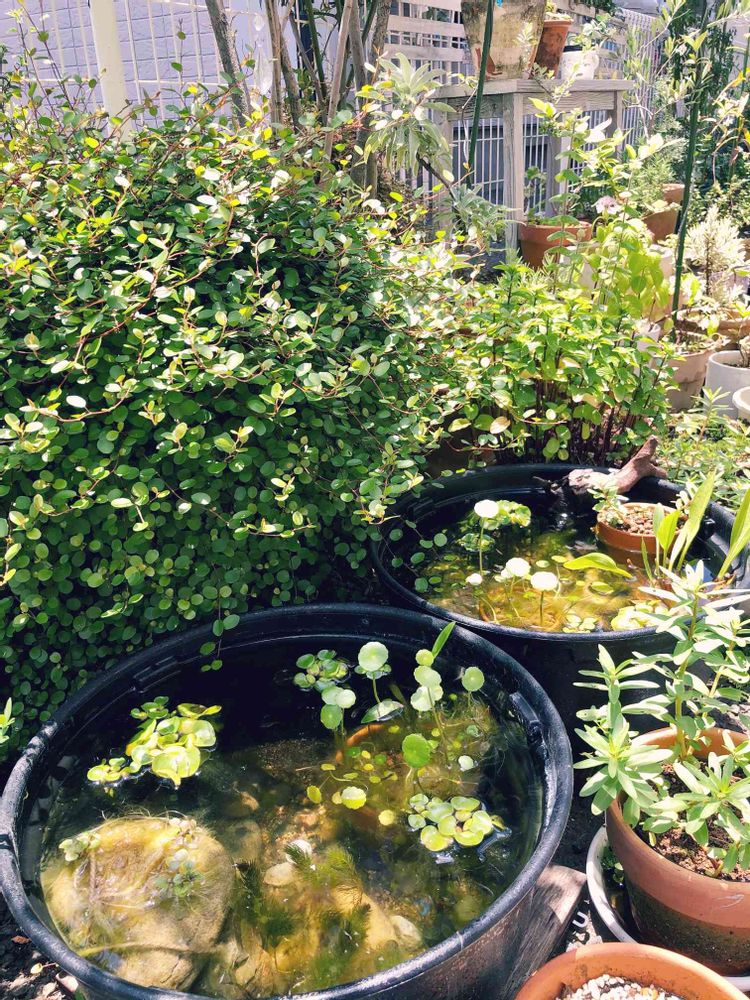 お庭ガーデニング🌱メダカビオトープ🐟 お部屋ガーデン🌿 アパートの裏の空きスペース、 コンクリートなので鉢で小さなお庭作り♪ パッチワークgarden🪴🪴🪴
