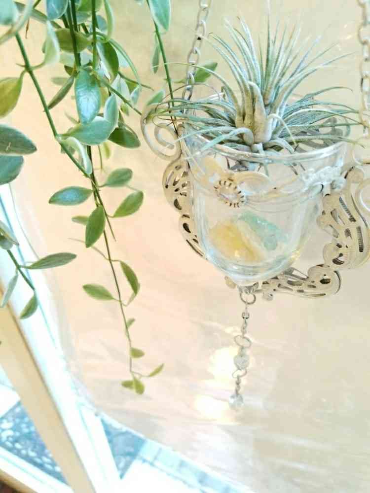 ドロップスキャンディ🍬みたいなクリスタルをガラスの吊り下げ用カップに4つ 入れて エアープランツの専用席になりました。