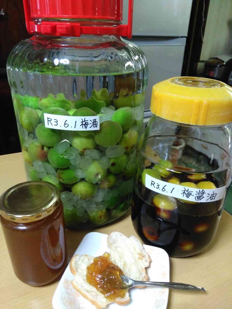 頂いた梅で梅酒、梅ジャム、梅の醤油漬けを作りました。