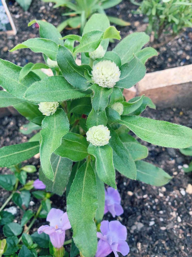 この子花壇用で茎が伸びないタイプ?みたい。花のとこだけ切って瓶に入れても可愛いかな?白よりピンクとかの千日紅にすれば良かったかな?はるなさんに可愛く瓶詰めしてもらいたい💛