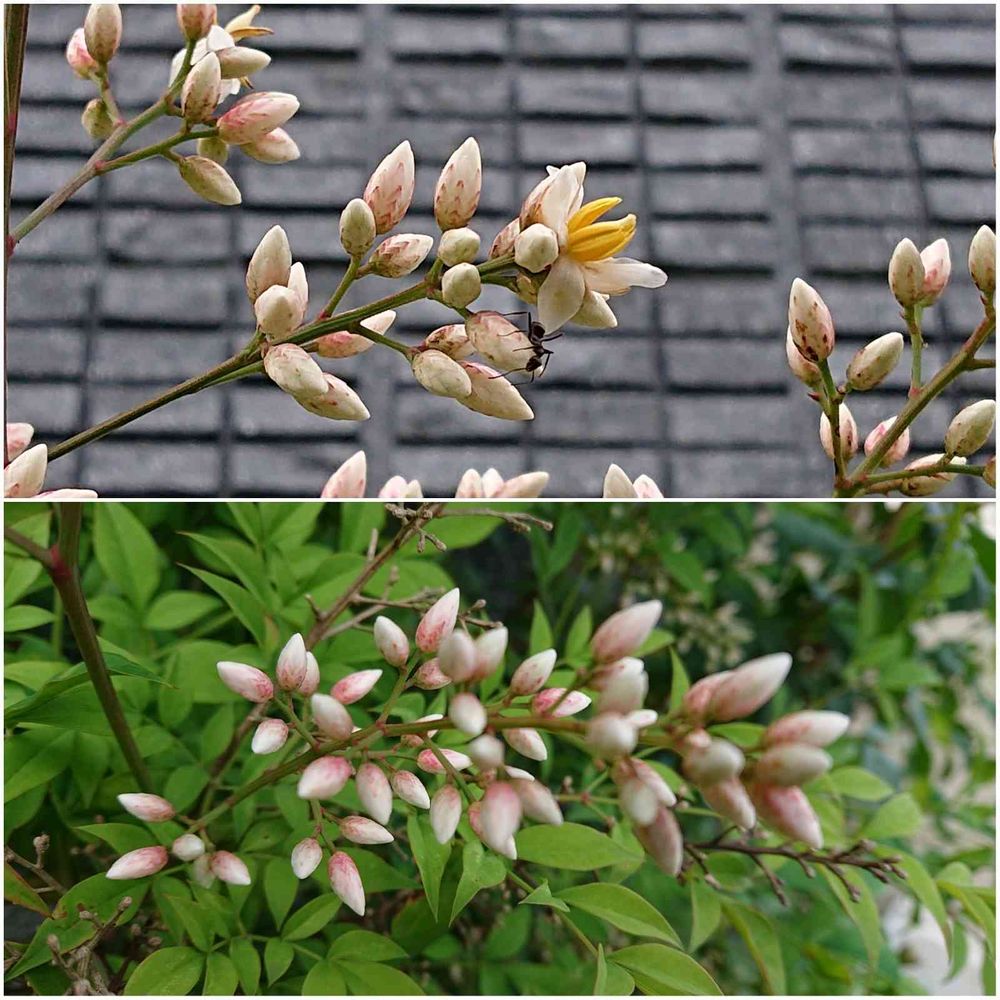 南天の花が咲き始めました。つぼみもほんのりピンク❣️で、美しいです。沢山実を付けてくださいね。