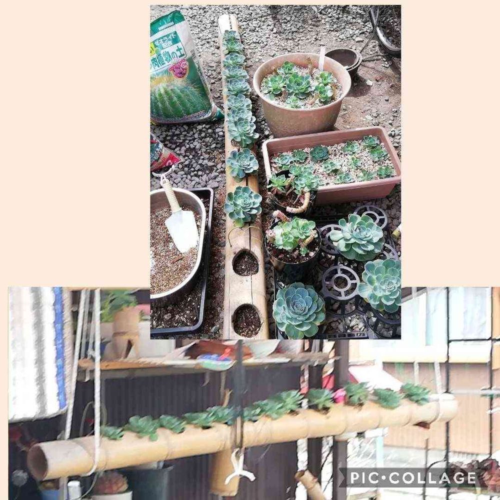 そんな事はどうでも良くて、暑い中 今朝から七福神様の入れ替え、植え替えをマムシ、スッポン、朝鮮人参、マカ入り勢力剤を3本 いや1本飲みながらやりましたよ!写真上が我が家の七福神様総勢、 で下の写真は孟宗竹に水抜き孔を空けた多肉用の連鉢です。