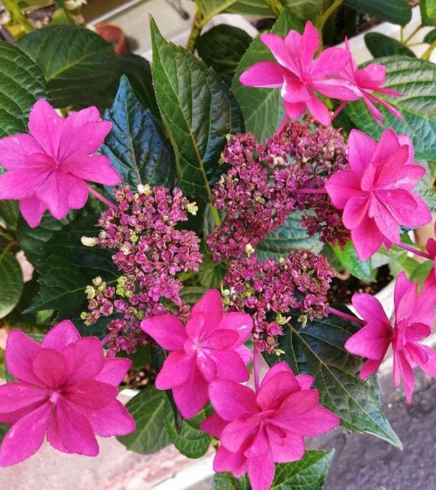 真紅の額あじさい、散歩途中で見かけました〜。