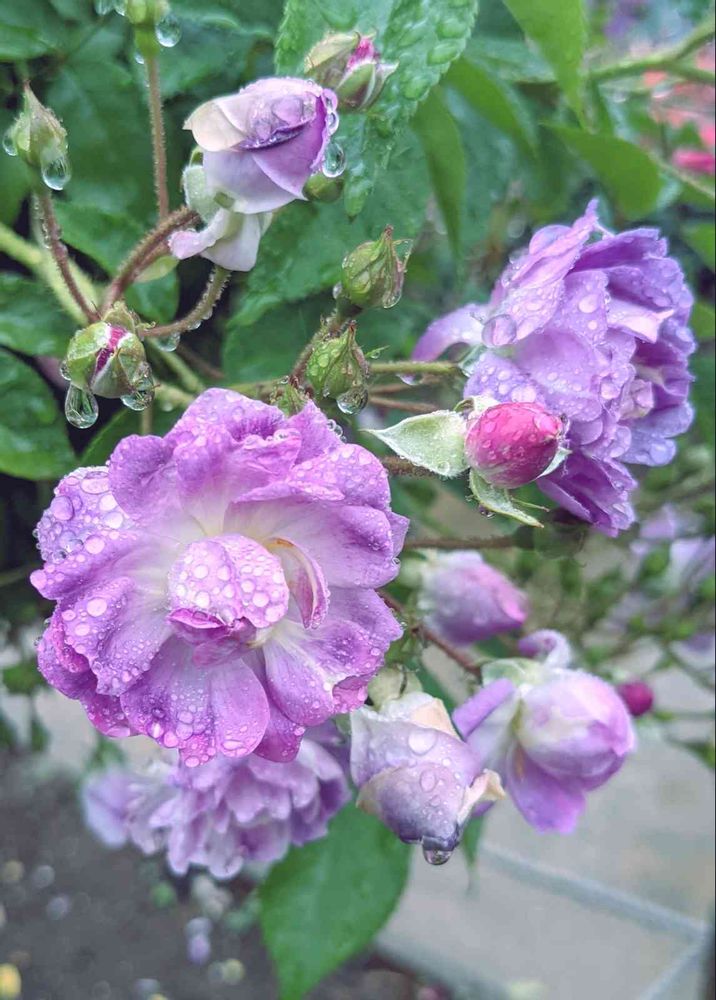 ブルーランブラー、雫を湛えて綺麗に咲いていますね🌹🌿💜