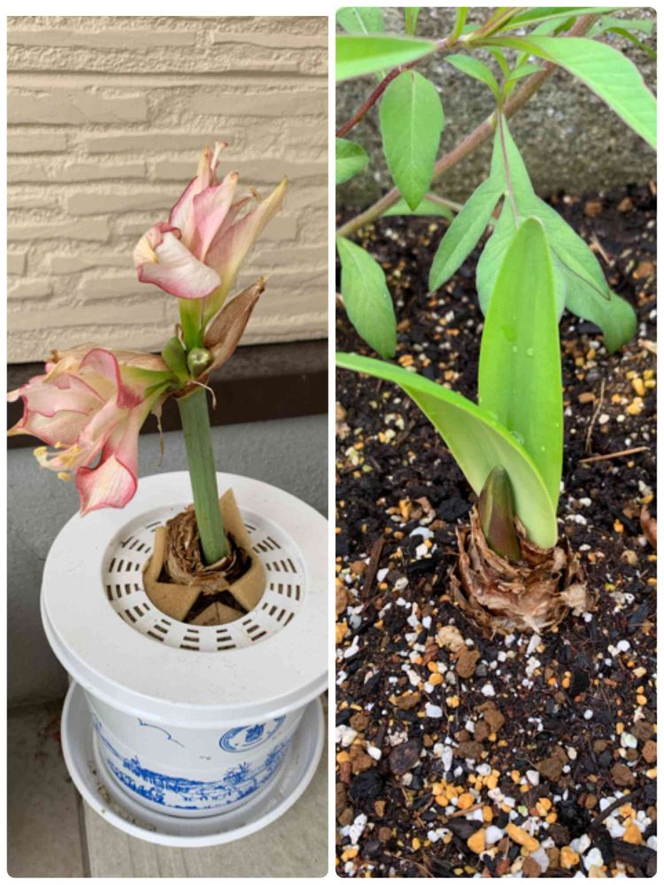 左ー4月末に咲いたアマリリス。葉は一枚もでず、かろうじて くしゃくしゃな花を咲かさせてました。Gsに投稿もしてない😅