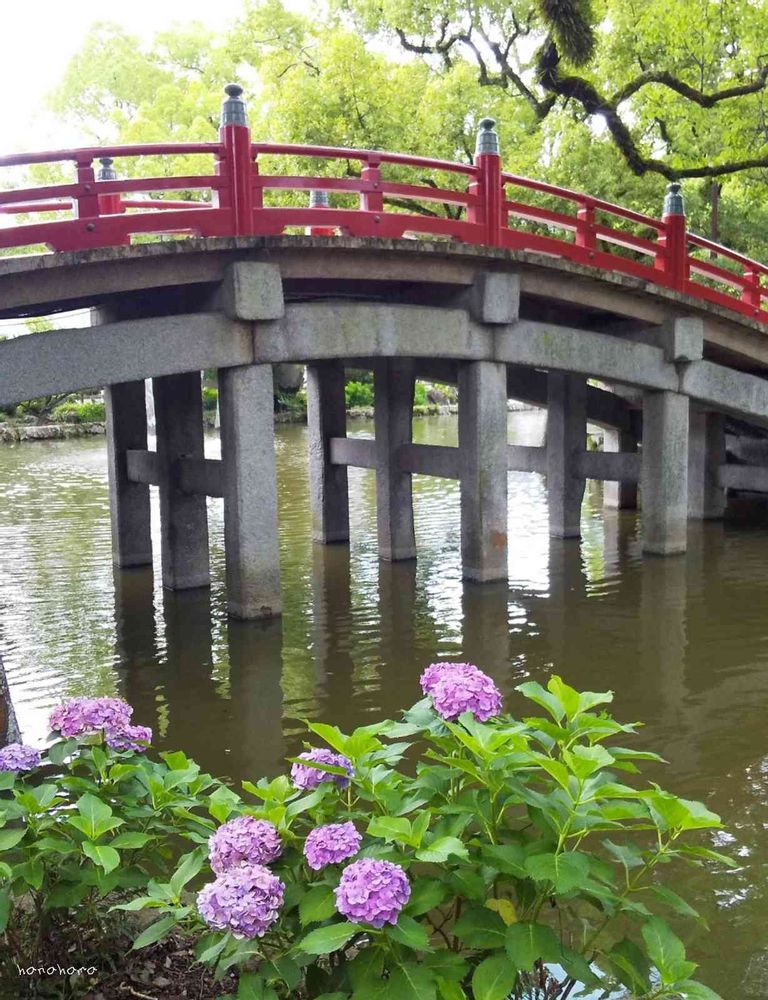 心をかたどった池に太鼓橋 紫陽花が映えます。