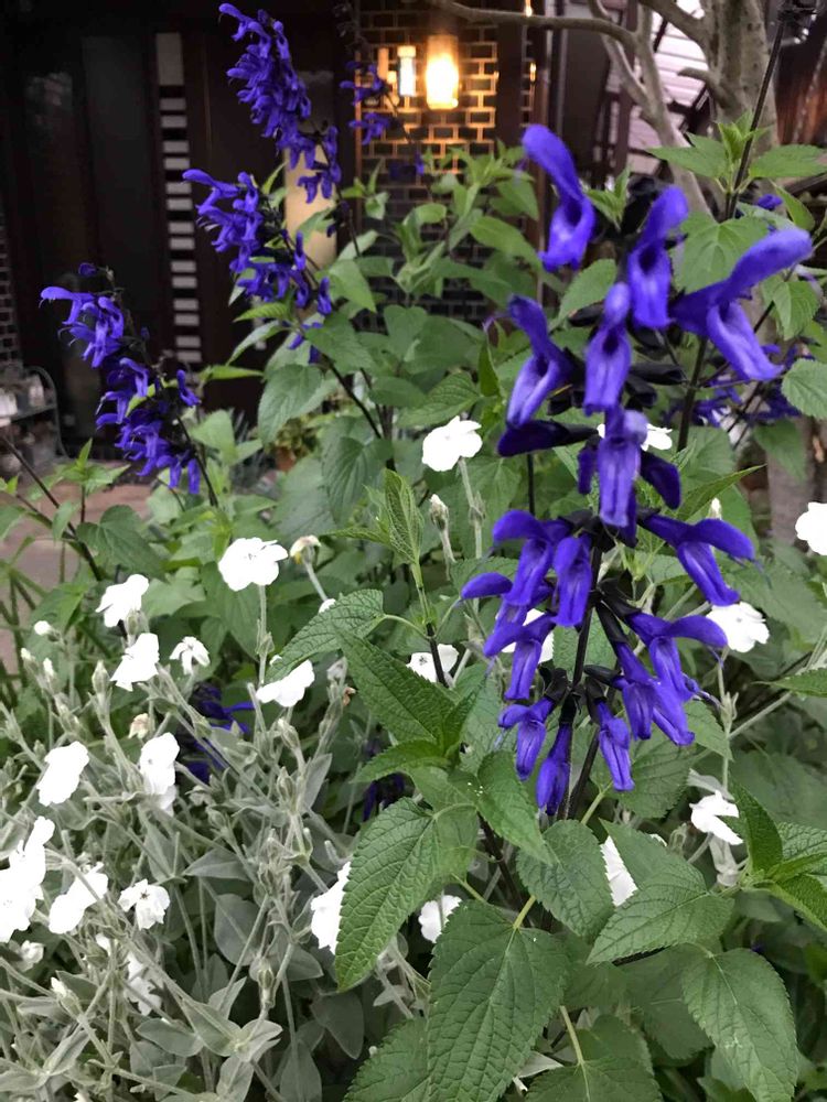 メドウセージを初めに植えていたのですが、背が高く支えにフランネル草を合わせて見たら、落ち着いて共存しています。色も好みなので、暫くは楽しみたいと思っています。💜🤍