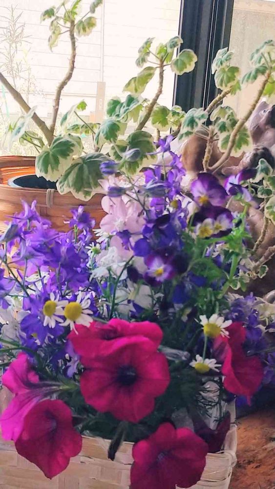 カモミール、チドリソウ、サフィニア、ビオラ☘️切り花で遊んでみました😍