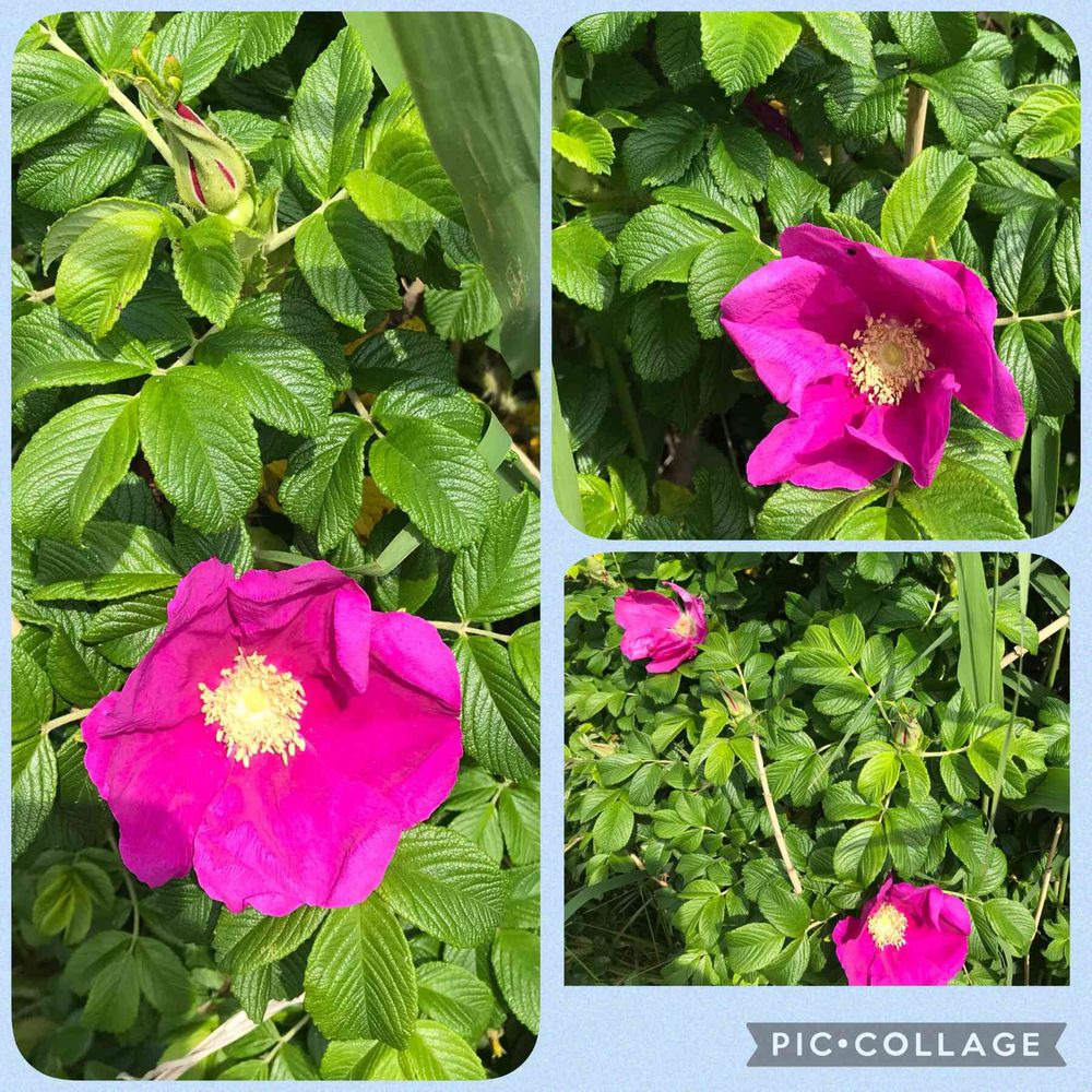 今朝娘を送った帰り道スーパー🅿️の生垣にハマナスの明るい色に