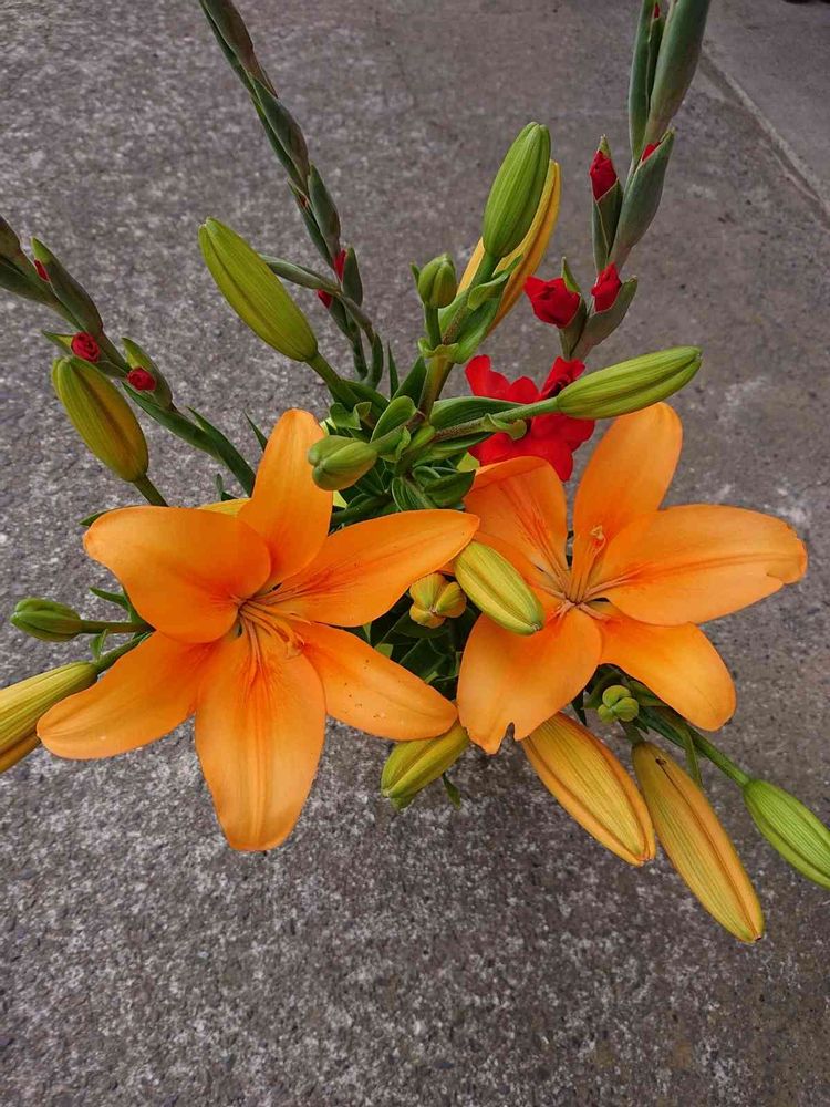 こんにちは✨オレンジのユリとグラジオラスが咲き始めました。
