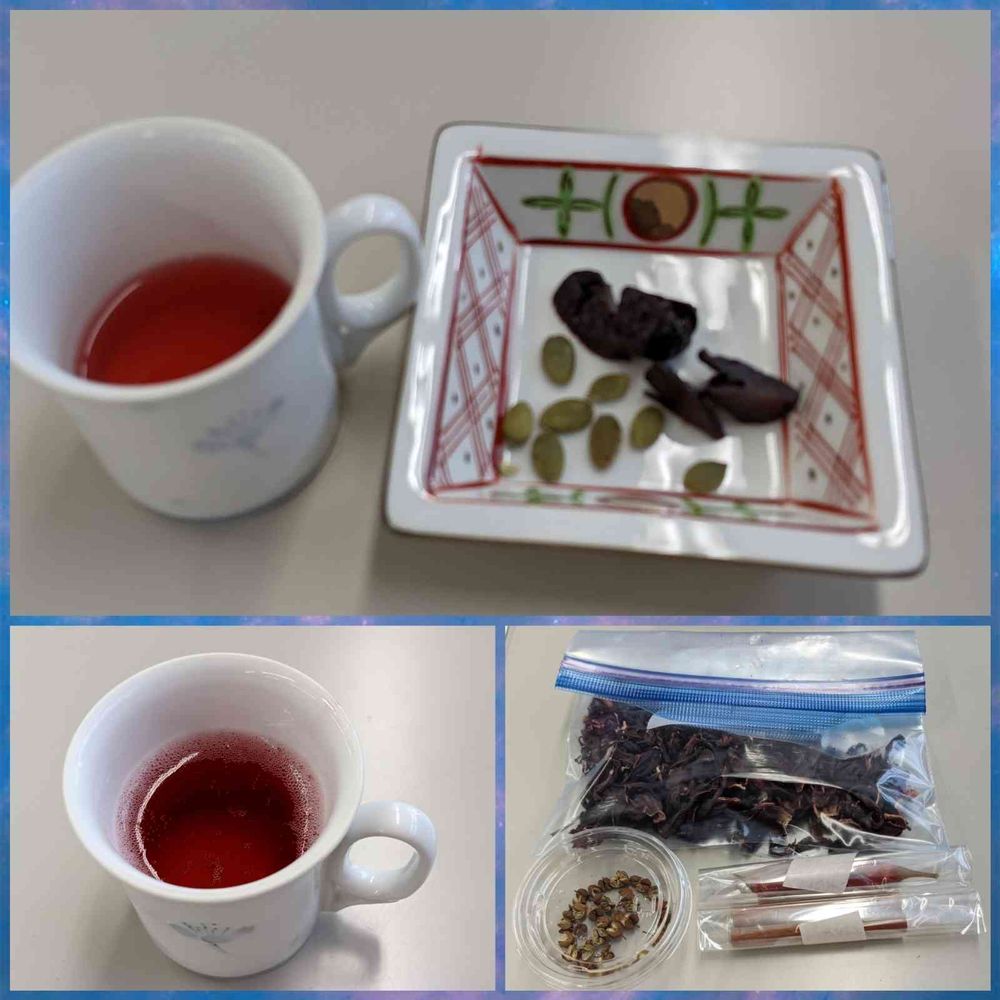 お土産に、ハイビスカス、サンシヨウ、シナモン、自家製の無農薬の鷹の爪を頂いたので、シロップを作ろうと思います。(右下)