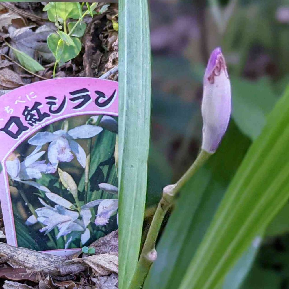 何年も前、小さな苗を3種類並べて植えて楽しみにしていたものの、翌年以降なかなか現れてくれず、もう諦めかけていました。先日未練の白花の札の近くに何かそれっぽく…。楽しみに見守っていましたが、まさか普通の紫蘭の色?…それが昨日にはこんな姿…まさかまさか遠い札の口紅シラン?!…明日は荒天の予報でこの蕾どうなることやらハラハラです。