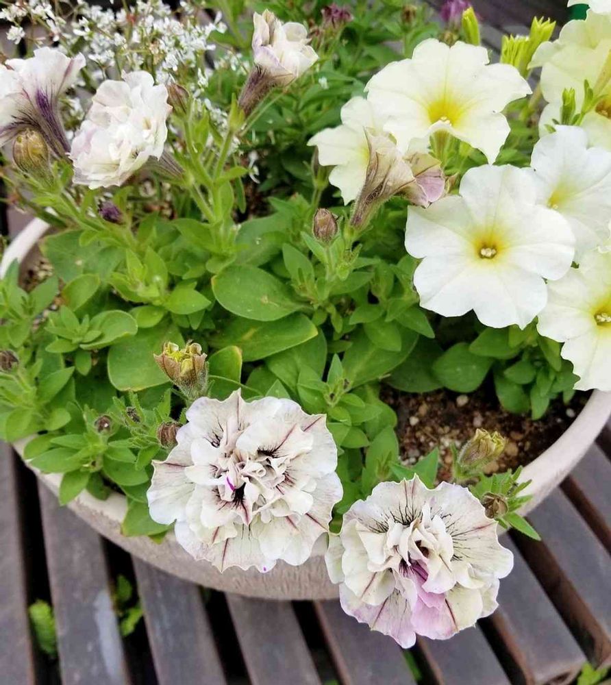 ジュリエットは切り戻し後やっと咲き始めました😊去年もだけど成長がかなり遅い。蕾はハンパない数です😲気温が上がってくると白っぽくなります😣 100円ペチュはすごい咲きっぷりで、徒長も少なく非常に優秀🙋 ブレスレスブラッシュは淡いピンクのユーフォルビアでキレイ