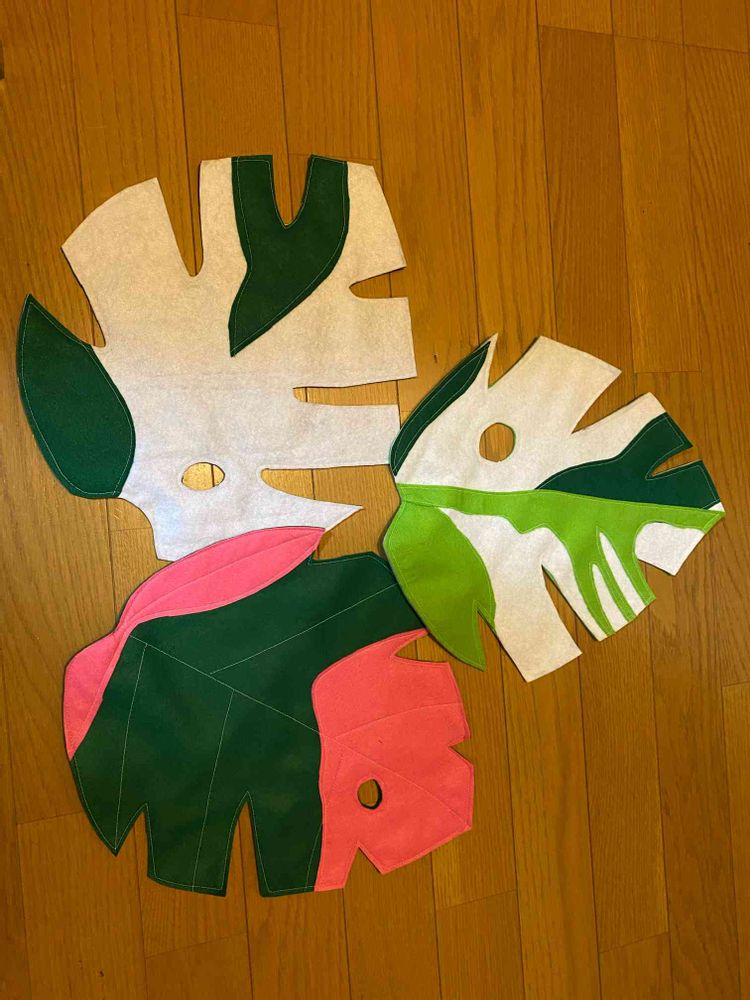 モンステラの葉っぱのオーダーを受けて、お試しに作った白の多い一枚目、もうちょっと斑入りにしたいなぁ…と思った二枚目、葉脈あったらどうかな…とピンクプリンセスっぽい感じの三枚目。