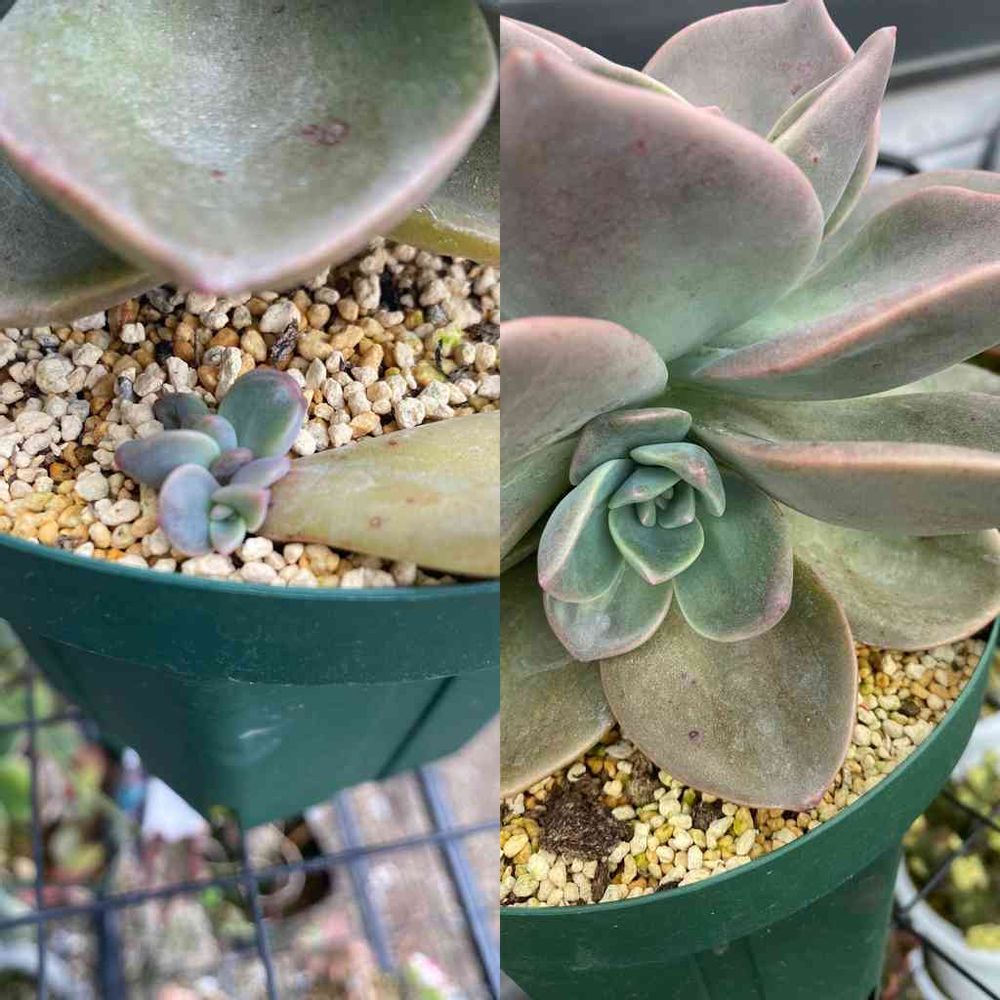 でかエケベリアのピーチパールの子供と葉挿しです😄