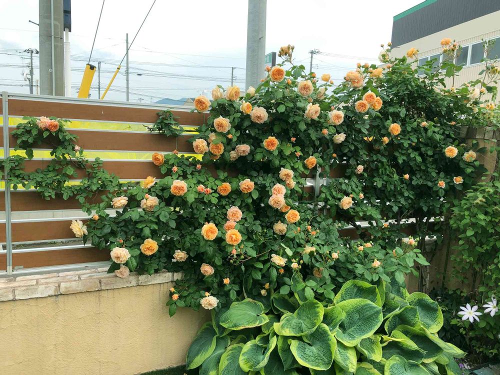 #バラ開花#おうちの庭#イングリッシュローズ#クラウン・プリンセス・マルガリータ#ばらが圧巻です#つるバラ