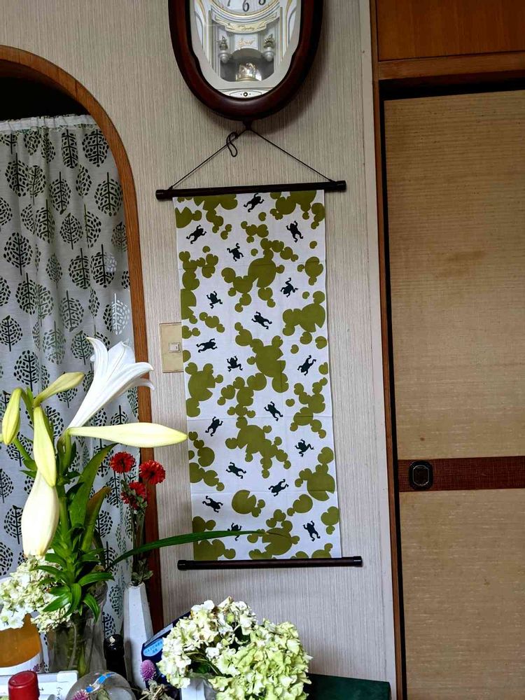 カエルの日本手拭のタペストリーと、テッポウユリと紫陽花💚😉😁