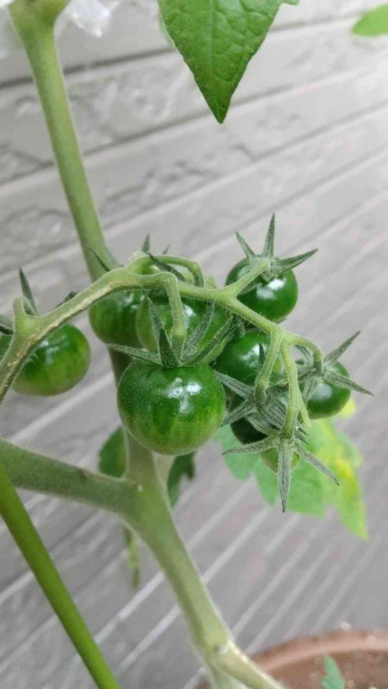 ミニトマト(つやぷるん)が大きくなってきました🍅名前のとおり?すでにつやつや光っています✨赤くなるのはもうしばらくかかりそうです